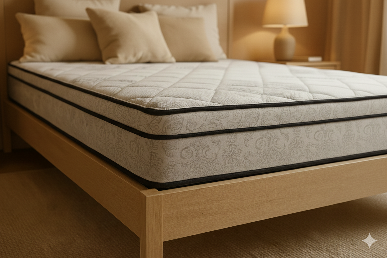 Experience comfort and support with our 9-inch Orthopaedic Euro Top Mattress, Valmont. It features a sturdy 416 coil, 13 gauge spring system with double tempered coils and edge guard for lasting support. Wrapped in organic cotton fabric with black edge tape, it combines ½ inch medium firm foam and 20 Oz Hallow Fibre for comfort. The Euro Top includes 1½ inch high-density foam over a ¾ inch foam support base, enhanced with a heavy-duty fibre pad for lumbar support and a ¼ inch quilted border for elegance and extra comfort.