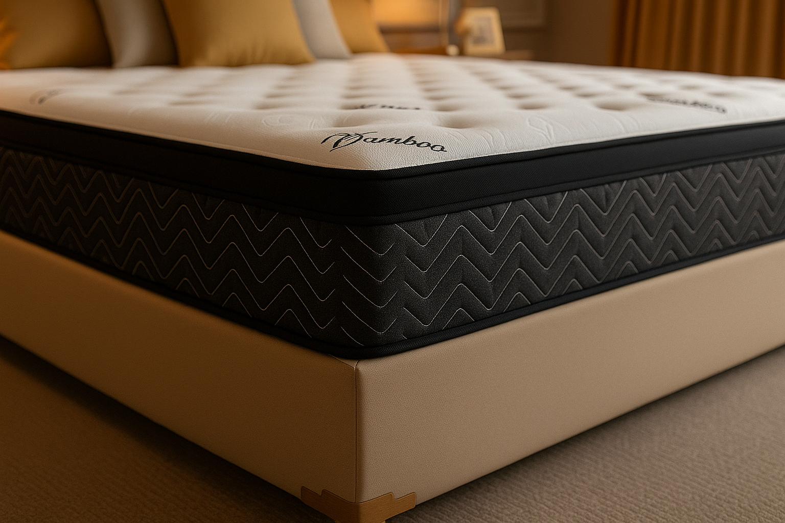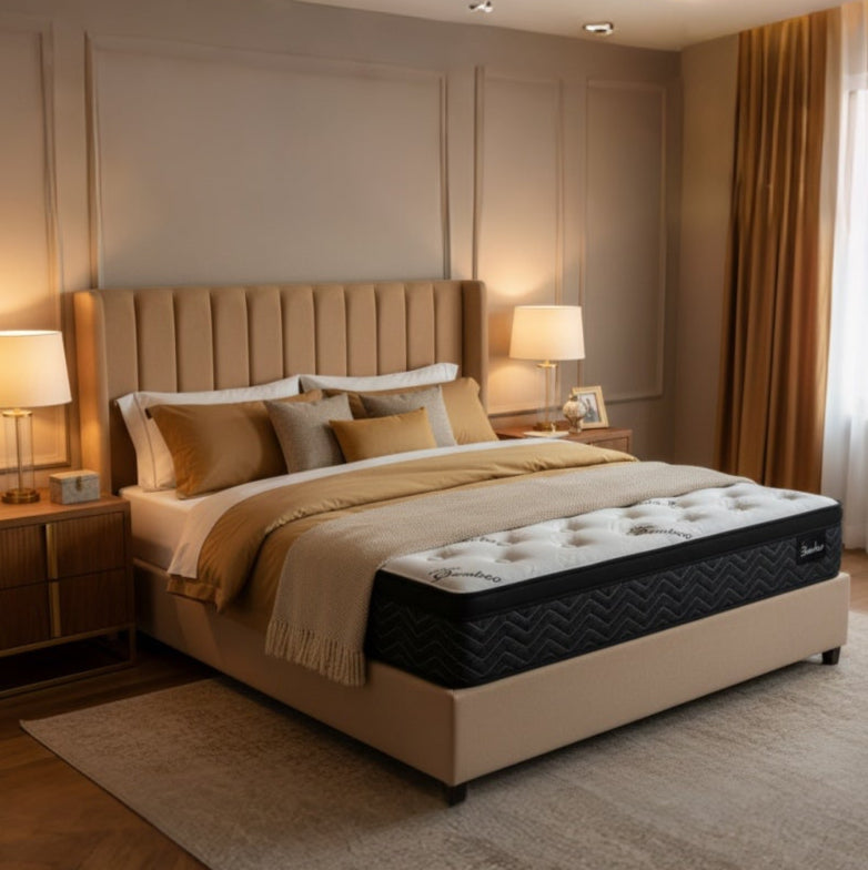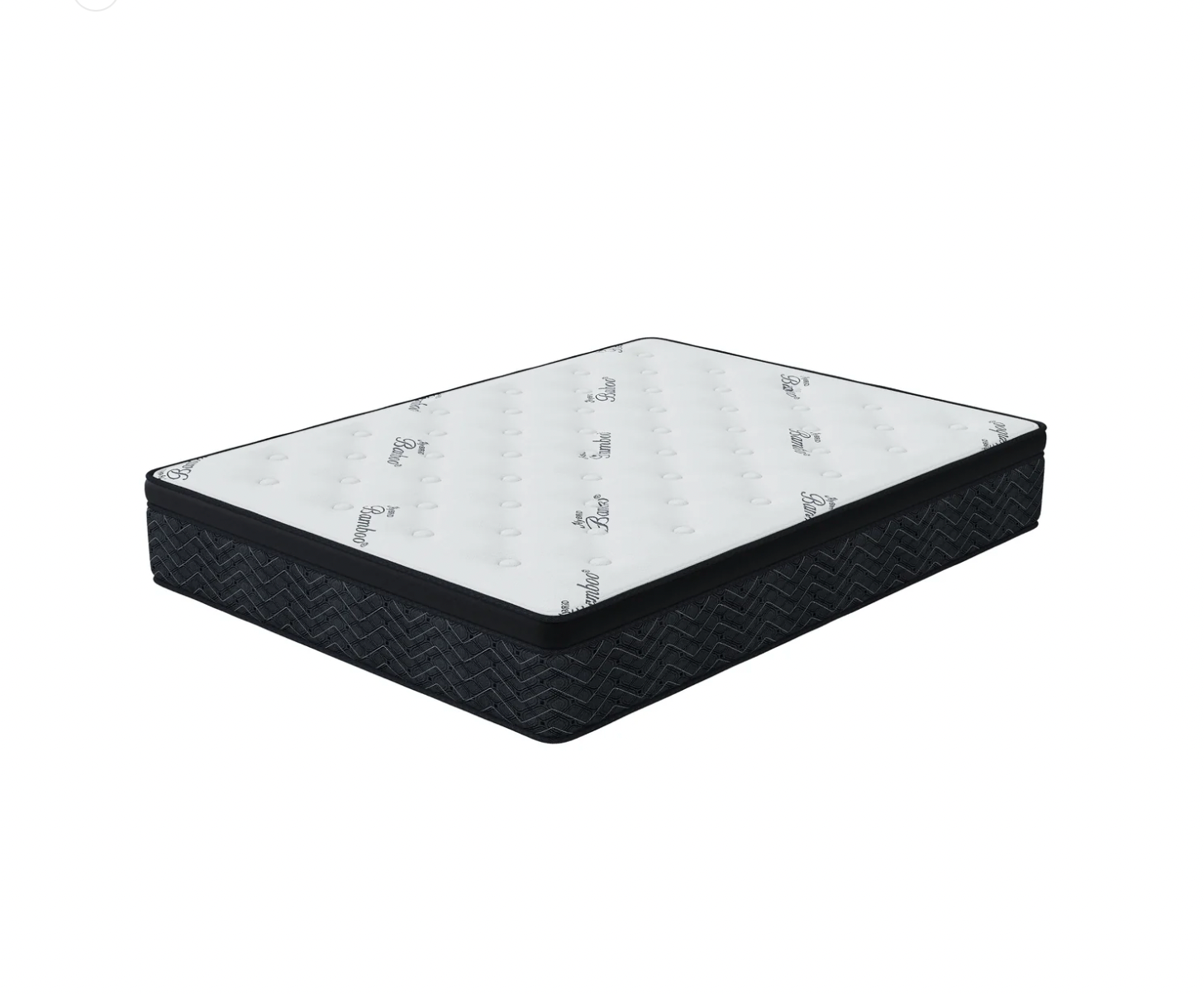 Discover Seraphine: an 10" oasis of comfort with a medium firm Euro top. Featuring a 416 coil, 13 gauge spring system and double tempered coils, it's designed for durability and edge-to-edge support. The mattress is wrapped in a soft Aloe Vera fabric with black edge tape, and includes a 1/2" medium firm foam with 20 Oz Hallow Fibre. The top layers consist of 2” medium firm foam in the pillow top and 1” foam support for motion absorption. With heavy-duty fibre pad for lumbar support and a 1/4" quilted border, it's the epitome of comfort and support.